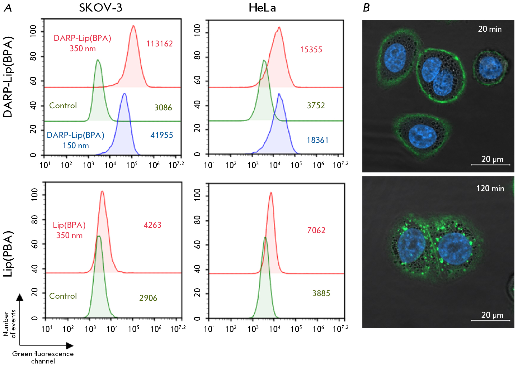 Fig. 3. Interaction of DARP-Lip(BPA) with the HER2 receptor in vitro. (A) Evaluation of the specific interaction of DARP-Lip(BPA) (upper pictograms) and Lip(BPA) (lower pictograms) with HER2-positive SKOV-3 cells and HeLa cells with normal HER2 expression levels by flow cytometry. The mean fluorescence intensity in the green channel is indicated on the pictograms. The green curve corresponds to fluorescent-unlabeled cells (control). The blue and red curves correspond to cells treated with 150 nM and 350 nM of DARP-Lip(BPA), respectively. (B) Confocal microscopy study of the interaction between DARP-Lip(BPA) and SKOV-3 cells. The duration of incubation of the cells in the presence of DARP-Lip(BPA) is indicated. Nuclei are stained with Hoechst 33342