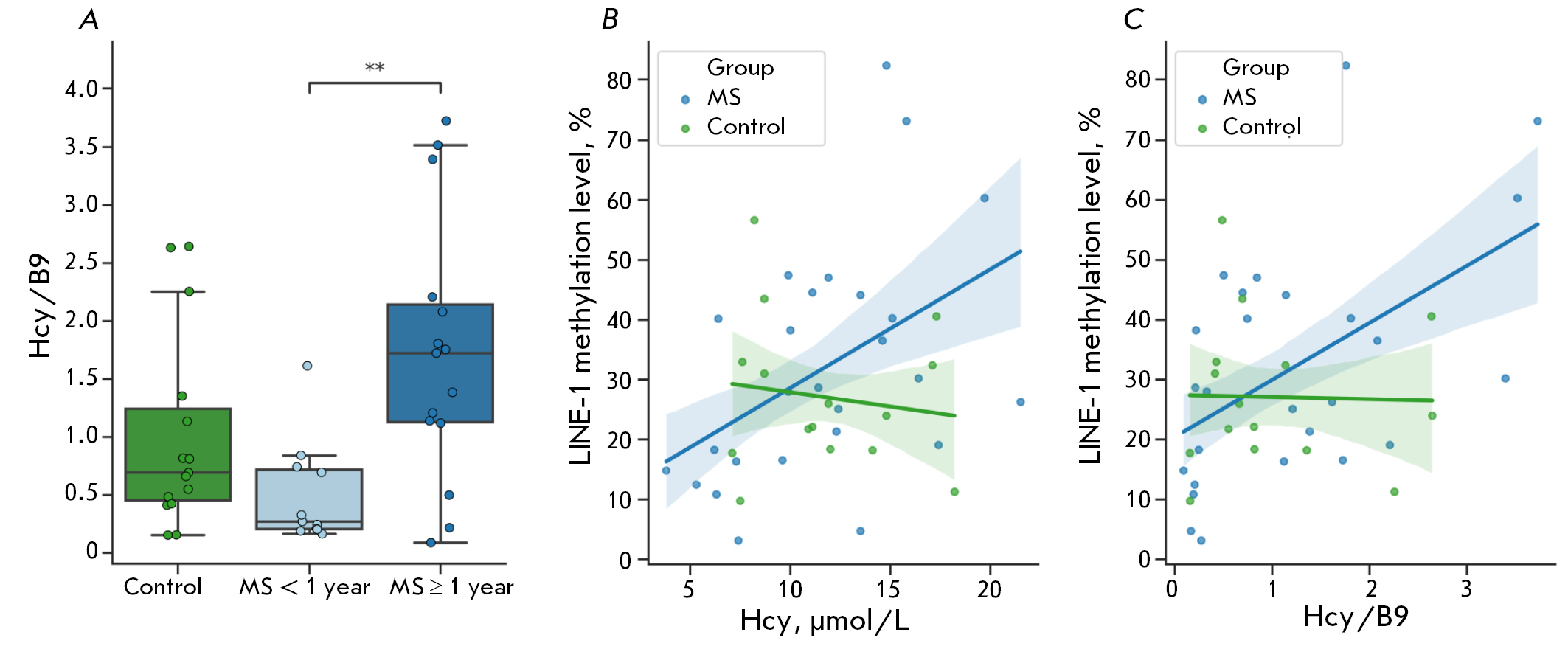 Fig. 5. Alterations in the ratio of serum homocysteine and folic acid concentrations (Hcy/B9) in individuals with MS (A), and the correlation between alterations in homocysteine levels (B) and Hcy/B9 ratios (C) with LINE-1 methylation levels in peripheral blood mononuclear cells. ** – statistically significant differences between the groups, p < 0.05 (Kruskal–Wallis test with subsequent pairwise comparisons)