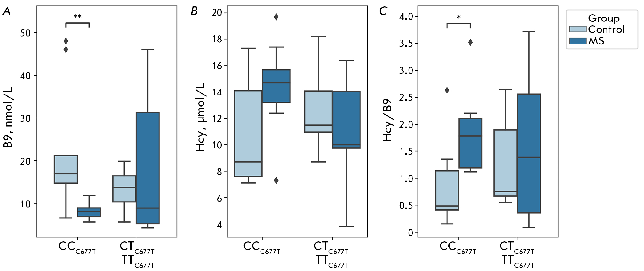 Fig. 6. Concentration of vitamin B9 (A) and homocysteine (B), and the Hcy/B9 ratio (C) in the individuals of the control group and the MS patients depending on the genotype for the C677T polymorphism of the MTHFR gene. ♦ – values deviating from the median by more than 1.5 interquartile range. * – statistically significant differences between the groups, p < 0.05; ** – statistically significant differences between the groups, p < 0.01
