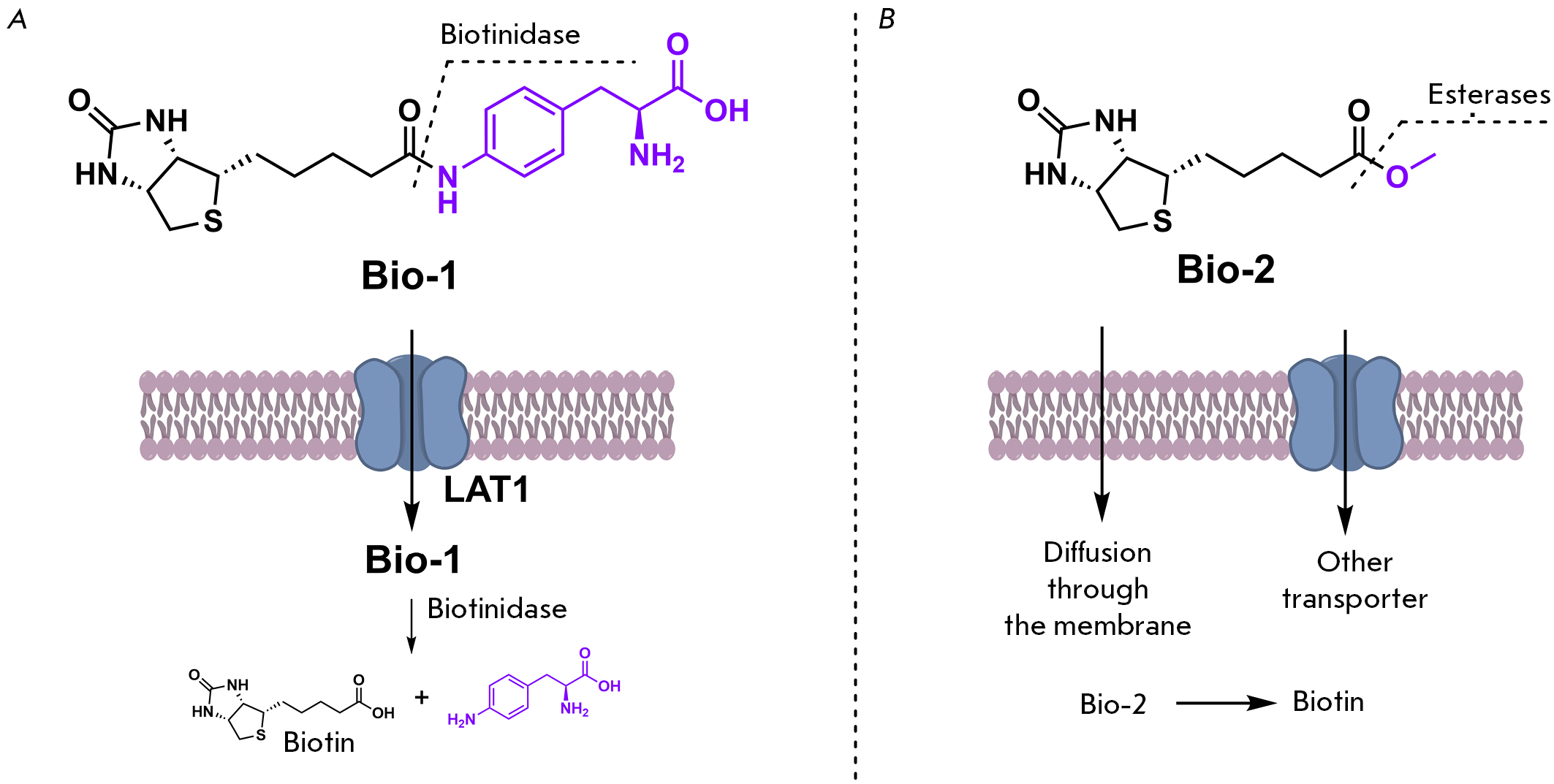 Fig. 5. Synthesized biotin analogs Bio-1 (A) and Bio-2 (B), with the proposed mechanism of membrane transport and subsequent enzymatic cleavage leading to the release of free biotin