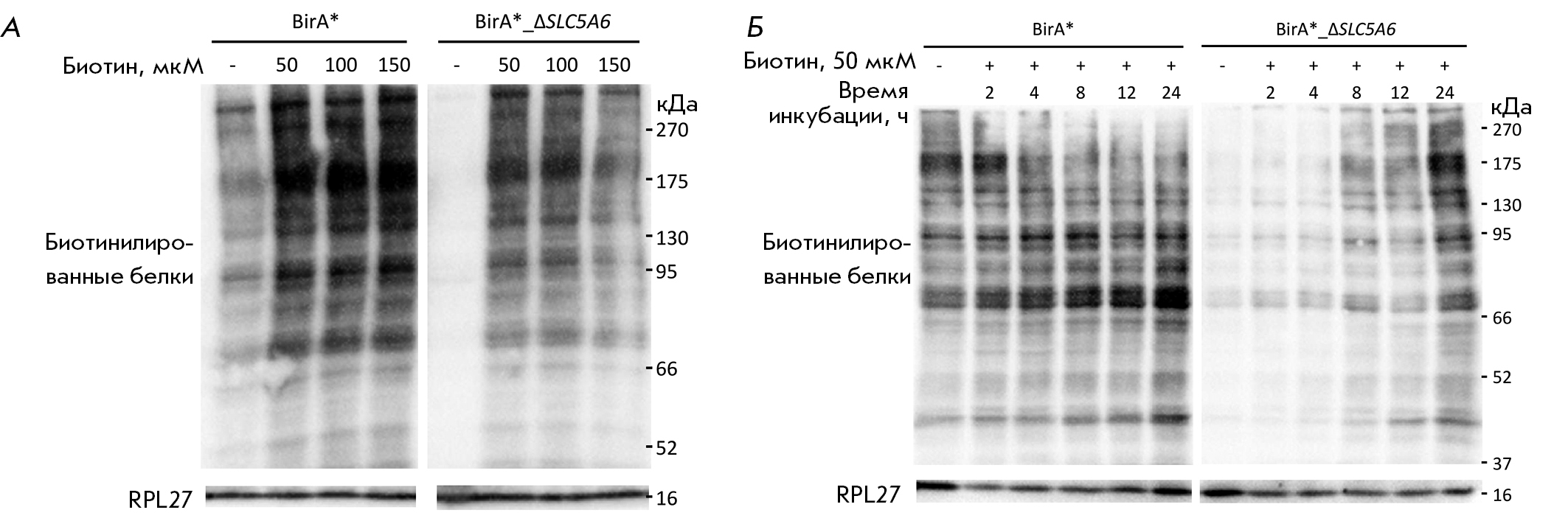 Fig. 4. Assessment of protein biotinylation levels in BirA* and BirA*_ΔSLC5A6 cells. (A) Dependence of the protein biotinylation level on biotin concentration in the medium after 24-h incubation. (B) Dependence of the protein biotinylation level on incubation time