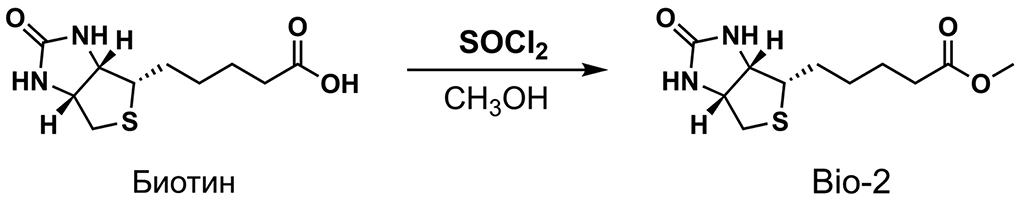 Biotin (1 g, 4.1 mmol) was dissolved in 20 mL of methanol, then cooled to 0°C, and thionyl chloride (2 mL, 20 mmol) was subsequently added dropwise. The reaction mixture was stirred at 20°C for 10 h, and the solvent was removed in vacuo. The residue was neutralized using 1 M NaHCO3. The precipitate was filtered off, washed with water, and dried in air, yielding Bio-2 (939 mg, 91%) after recrystallization from acetone.