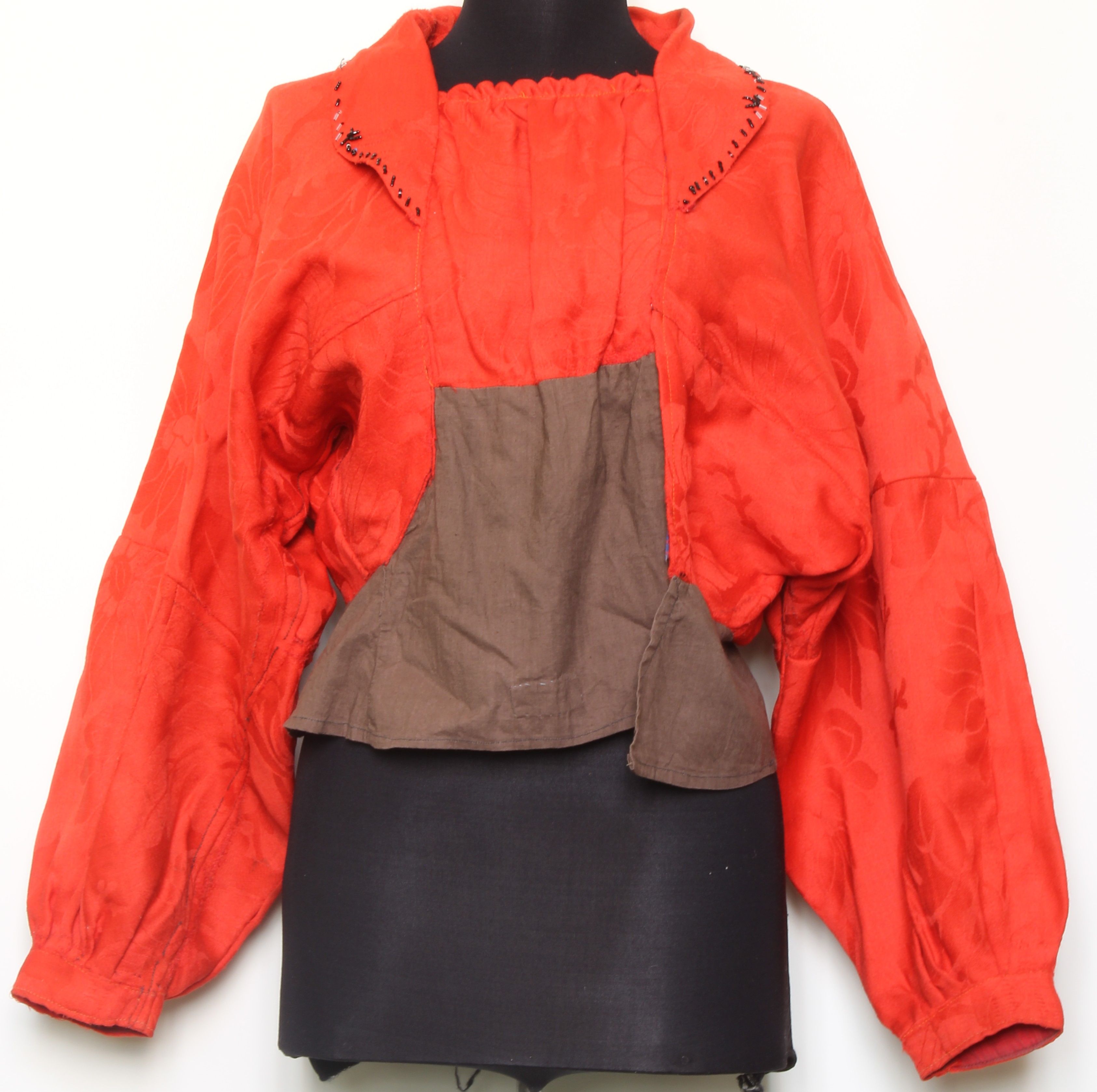 Рубаха японка (вариант названия ‒ китайка) отличается по покрою, не имеет наплечных вставок (рис. 2). Выполнялась из перегнутого полотна ткани, к верхней части которого пришивались рукава. Зафиксированы японки, рукава которых выкроены вместе со спинкой и передом, полотнища соединены швом по центру спинки. Спереди оформлялся прямой разрез с застежкой на две металлические кнопки. Рукава, как правило, собраны под манжеты. Воротник отложной, широкий, чаще всего с закругленными краями, декорированный бисером черного цвета или нашивками, выполненными из ткани другой расцветки. Глубокий вырез горловины закрывался прямоугольной вставкой, которую, как правило, собирали в мелкие складки буфики, декорировали бисером.