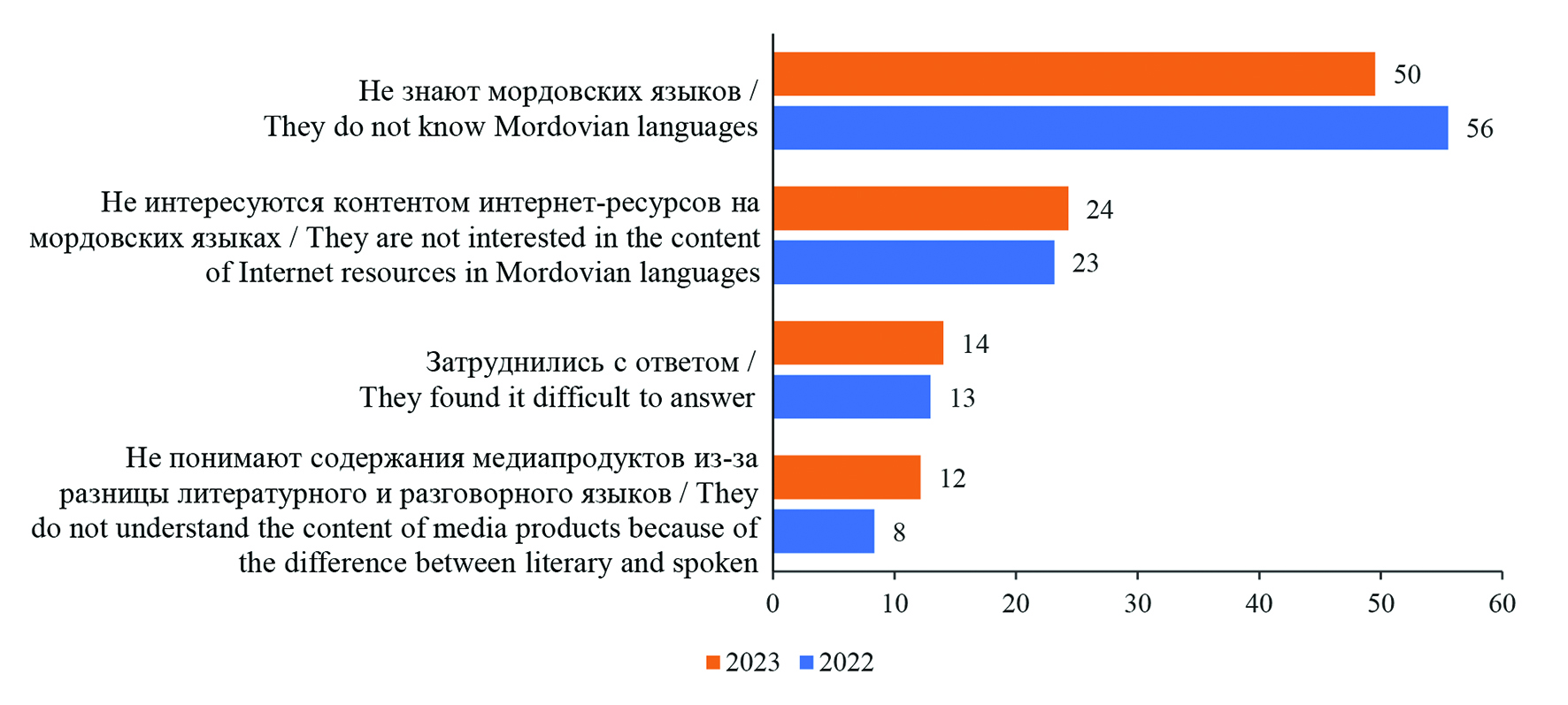 Большая часть респондентов (в 2023 г. – 83 %, в 2022 г. – 81 %) не использует медиапродукцию (газеты, журналы, радио, телепередачи) на мордовских языках. Основная причина отказа от потребления контента на мордовских языках – незнание языка (в 2023 г. – 53 %, в 2022 г. – 60 %) (рис. 2). Четвертая часть опрошенных отметила отсутствие интереса к содержанию передач и интернет-ресурсов на мордовских языках. На данную причину указал каждый третий респондент в возрасте от 18 до 29 лет (33 %), каждый четвертый – среди представителей среднего поколения (29 %), каждый пятый – среди лиц старшей возрастной категории (22 %). Содержание медиаресурсов на миноритарном языке в большей степени безразлично носителям языков, составляющим целевую аудиторию национальных медиа (мокша: в 2023 г. – 32 %, в 2022 г. – 34 %; эрзя: 33 и 36 % соответственно). Кроме того, 19 % мокшан и 25 % эрзян утверждали, что языки, на которых ведутся передачи и пишутся тексты, существенно отличаются от разговорного языка и непонятны им (рис. 2).