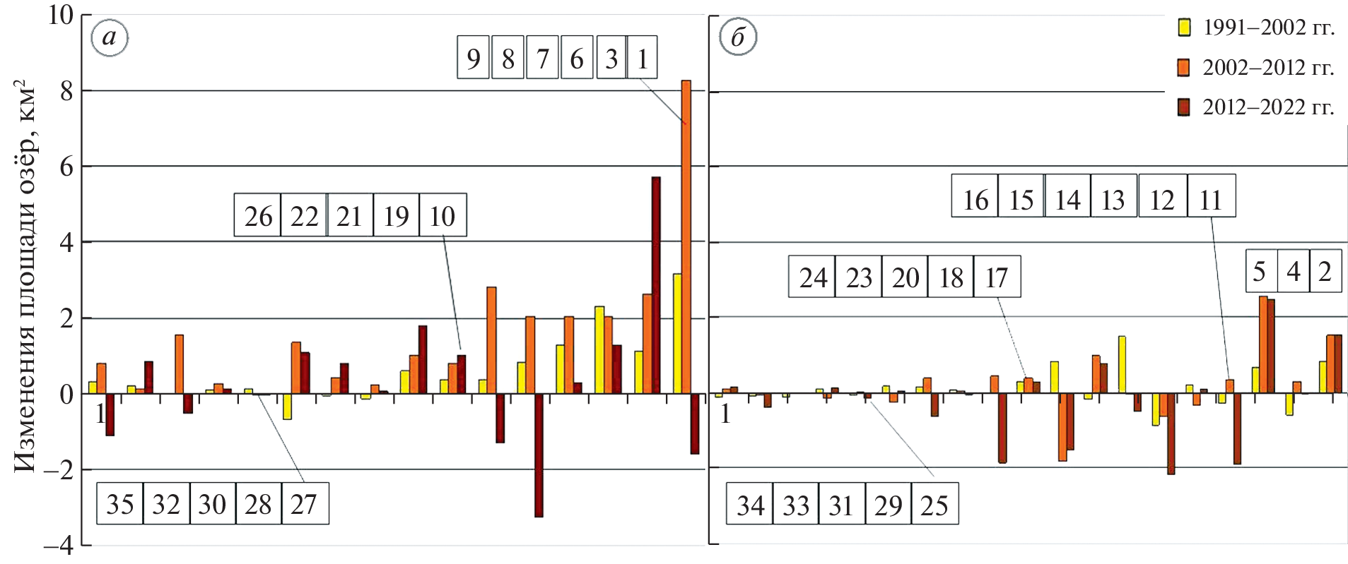 Approximately 3,790 lakes of various genesis existed in the Svalbard archipelago in 2008–2012, the total area of which reached 395 km2. Among them, periglacial lakes were new objects which had been formed since the beginning of the 20th century due to the deglaciation of the archipelago. We found 554 glacial lakes which areas exceeded 0.01 km2. The total area of these lakes amounted to about a half of the area of all the lakes in the archipelago – 185 km2, and two thirds of this value were large glacial lakes. The paper presents the spatial distribution of large periglacial lakes and variability of them caused by the climate warming in the archipelago. At present, there are 35 periglacial lakes (over 1 km2 in size); all of them are in contact with glaciers and the greater part of them are dammed by the terminal moraines or by a glacier itself. According to the cartographic data of the Norwegian Polar Institute and satellite images, the areas of large lakes were determined successively in 1991, 2002, 2012, and 2022. For the period from 1991 to 2012, there was a twofold increase in their area from 24.4 to 53.7 km2, but in 2012–2022 this process slowed down. On the east of the archipelago, where the inland ice is widespread, the process of the lake formation is much slower. It had been noted that on the west all large glacial lakes were formed after 1936 due to active retreat of the glaciers. At the same time, both on the north and east, most of the large glacial lakes existed prior to 1936. During the periods under consideration, changes in the areas of individual objects reached multiple values. The most large-scale changes in the lake areas were associated with the ablation of glacial fronts in contact with the lake, a glacier surge, and outbursts of a few dammed lakes. Six lakes were identified, where the water level drop reached tens of meters. Despite the slowdown in the formation of lakes in the last decade, the enlargement of lakes continues. Relative increase in the total area of the large periglacial lakes over the past 30 years on the west and east of the archipelago is in direct proportion to decreasing in glaciation of these regions. Thus, the process of formation of large periglacial lakes may be used as an indicator of climate change in the archipelago.