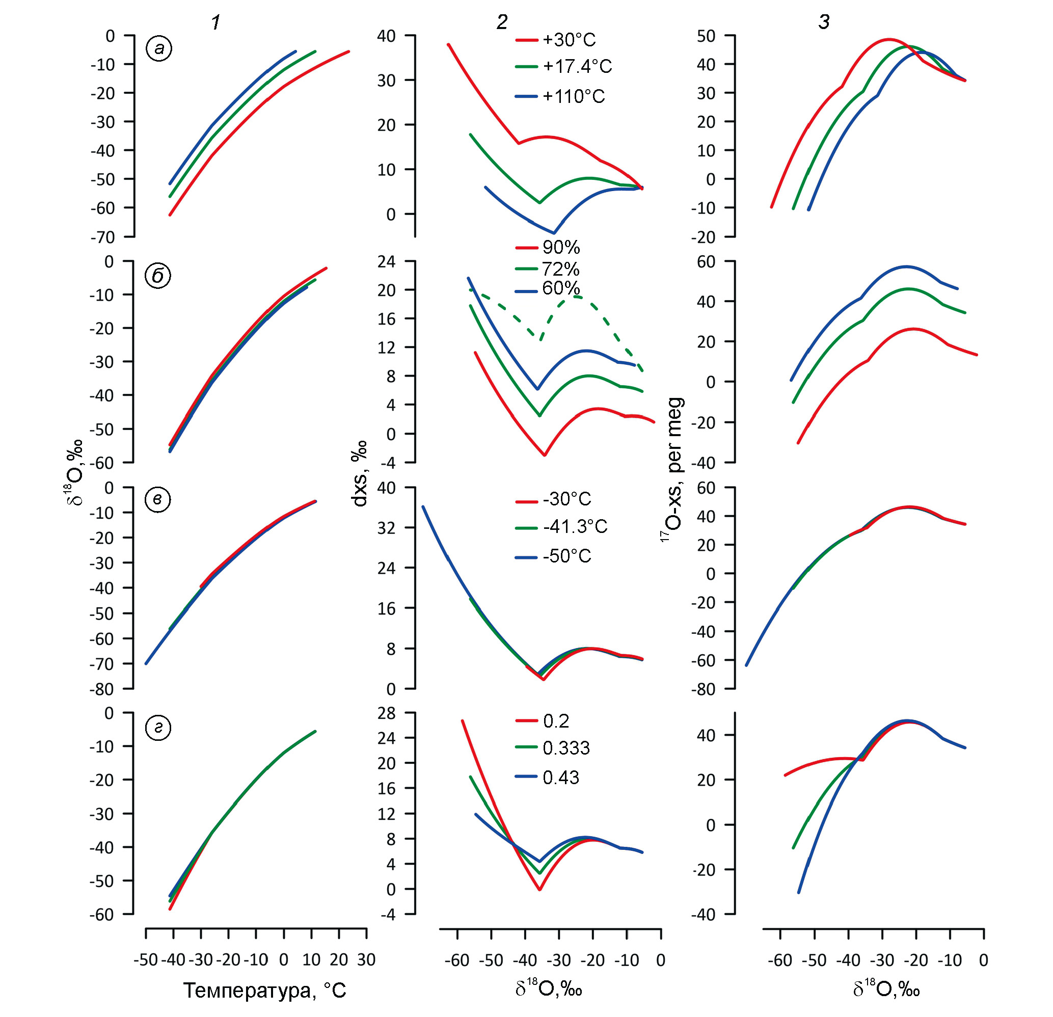 В отличие от dxs «эксцесс кислорода 7» (¹⁷O-xs) очень слабо зависит от температуры, поскольку равновесные коэффициенты фракционирования для кислорода 17 и кислорода 18 связаны соотношением αe¹⁷O=αe¹⁸O0.529 (Barkan, Lutz, 2005). Кинетическое фракционирование для кислорода 18 интенсивнее, чем для кислорода 17 (ln(aef¹⁷O)/ /ln(aef¹⁸O) < 0.528), поэтому при h < 100% значения ¹⁷O-xs в водяном паре выше, чем в воде. Влияние коэффициента k на ¹⁷O-xs незначительно, а значения L и Λ¹⁷O/Λ¹⁸O, наоборот, очень сильно влияют на «эксцесс кислорода 17» (см. рис. 2, б).