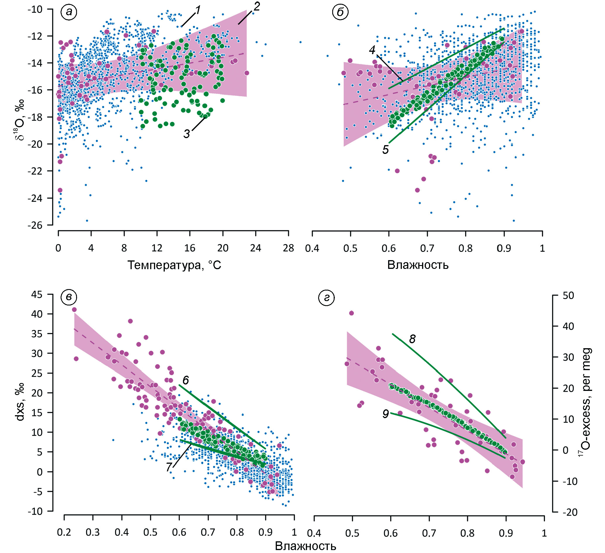 а–г — влияние различных факторов на изотопный состав: а — температуры поверхности моря, б — относительной влажности воздуха в источнике влаги, в — температуры конденсации в конце траектории, г — параметра s₀, контролирующего степень перенасыщения водяного пара надо льдом при формировании смешанных и твёрдых осадков. Пунктирной линией на рис. 3, б показано распределение значений dln вдоль траектории для относительной влажности 72%.