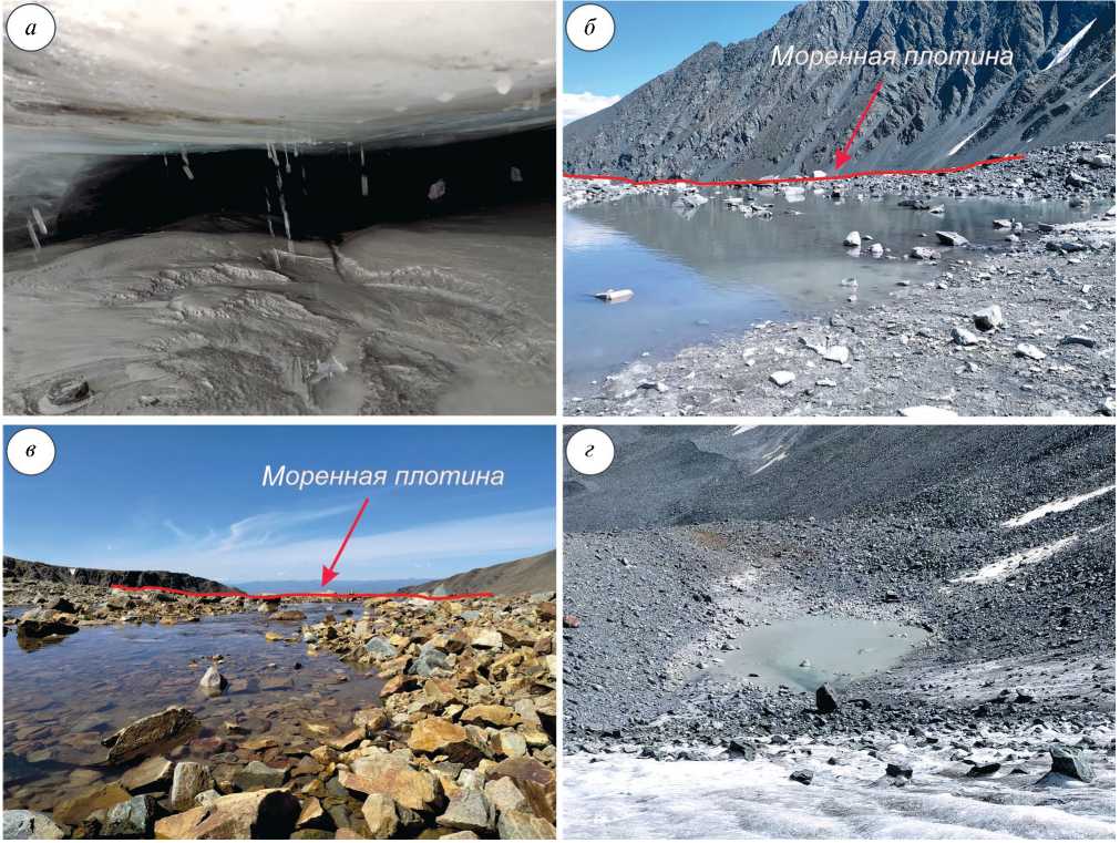 Fig. 1. Modes of water outflow from periglacial lakes: a – outflow of water through the grotto in the glacier (Lake «Chill»); б – water overflow over the crest of the moraine dam (Lake «HB»); в – temporary watercourse through the dam (Lake «Gachi-Kol»); г – filtration (Lake «Chill»). Photos by V. A. Rasputina in July – August 2021/22