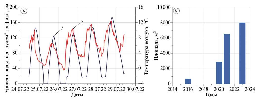 Fig. 2. Changes in the water level of the periglacial lake «Chill» (a) and the area of the periglacial lake «Gachi-Kol» (б) over time during the transgressive stage of evolution: 1 – course of the water level at the water gauge station on Lake «Chill»; 2 – course air temperature at the weather station located on the Nekrasova Glacier, located at an altitude of 3000 m a. s. l.