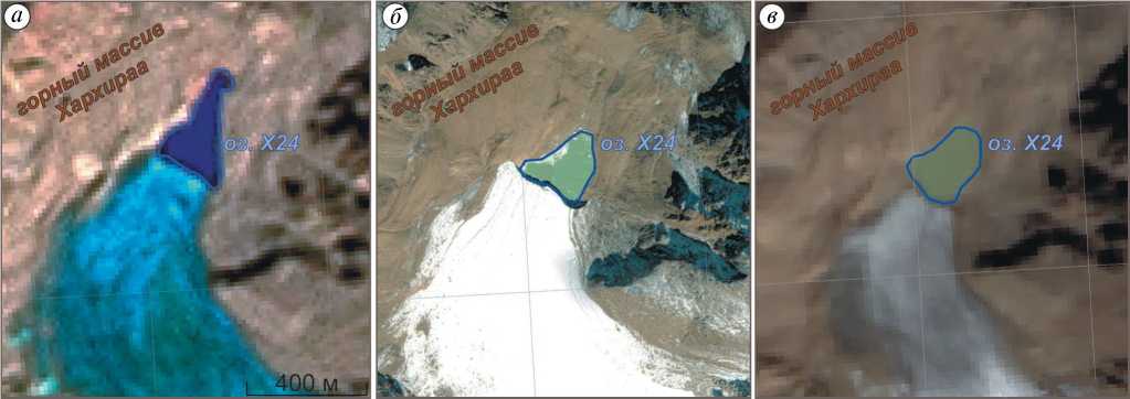 Fig. 3. Change in the area of Lake X24 in the Khovd river catchment (Kharhiraa mountain range, Northwestern Mongolia) from 2000 to 2022: а – June 2000, б – August 2012, в – August 2022 (the name is given according to the developing catalog of lakes). Satellite images from the site: https://www.sentinel-hub.com/