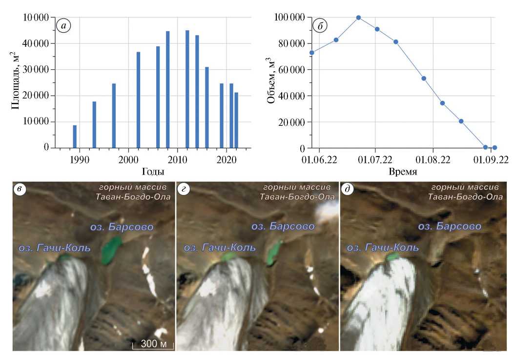Отмечено, что разрушение мореной дамбы или спуск озёрных вод по фильтрационным каналам внутри моренной перемычки может протекать достаточно быстро (от нескольких часов до нескольких месяцев), что может привести либо к полному исчезновению озера, либо к переходу водоёма на любую стадию развития. Так, при визуальном обследовании озера «Барсово» (горный массив Таван-Богдо-Ола) в 2021 г. был выявлен поверхностный отток, который при понижении уровня воды в водоёме переходил из поверхностного в подземный и фиксировался на внешней стороне подпруживающей морены в виде высачивания. Это позволило выдвинуть предположение о высокой вероятности спуска озера (Распутина и др., 2022). В конце июня 2022 г., согласно анализу спутниковых снимков, начался процесс истечения воды, и к 3 сентября водоём был полностью осушен (см. рис. 4, в‒д). На основе выполненных в 2021 г. батиметрической и тахеометрической съёмок были рассчитаны величины объёмов воды в озере в период его спуска (см. рис. 4, б). Так как от высоты положения и диаметра фильтрационных каналов зависит объём и максимальный расход прорывного паводка, достаточно равномерный спуск озера «Барсово» осуществлялся по каналам с постоянными размерами, расположенными в нижней части озёрной котловины. Отметим, что для приледниковых водоёмов снижение уровня воды в период абляции может быть признаком высокой прорывоопасности озера и требует проведения мониторинговых наблюдений.