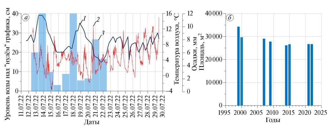 Рис. 5. Изменение во времени гидролого-морфометрических характеристик: уровня воды в зависимости от метеорологических характеристик (a) и площади зеркала (б) моренного озера «Таможенное» в период пострегрессивной стадии развития: 1 – ход уровня воды на водомерном посту на озере «Таможенное»; 2 – ход температуры воздуха; 3 – ход осадков на метеостанции, расположенной в прибрежной зоне озера на высоте 2770 м над ур. моря