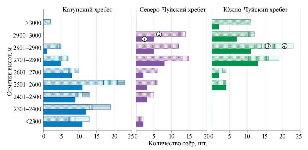 До 2000 г. на территории Северо-Чуйского и Южно-Чуйского хребтов основная часть озёр находилась в интервале 2700—2800 м, на территории Катунского хребта — в интервале 2300—2400 м. Наибольшее количество озёр на 2022 г. находится в краевых частях современных ледников: в интервале высот 2900—3000 м над ур. моря для Северо-Чуйского хребта, в интервале 2800—2900 м над ур. моря — для Южно-Чуйского хребта и 2500—2600 м над ур. моря — для Катунского хребта. В соответствии с этим распределением отмечено, что верхняя граница интервала, в котором располагалось максимальное количество приледниковых и моренных озёр, до 2000 г. была по высоте ниже на 100–200 м, что связано с происходящим отступанием краёв ледников. Для всех хребтов характерно, что основная часть водоёмов в трансгрессивной стадии расположена в самых высотных интервалах, в то время как озёра в пострегрессивной стадии в подавляющем количестве находятся в интервалах высот, расположенных ниже, где быстрее всего утрачивается связь с ледниками.