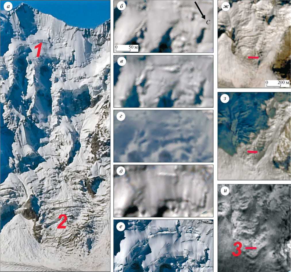 Fig. 3. Areas of anomalous dynamics of glaciers on the slope of Mount Dzhangitau Zapadnaya: а – general view of the slope of Mount Dzhangitau 19.09.2023 (helicopter photo by M. D. Dokukin; 1 – a section of a hanging glacier represented on fragments of Sentinel-2 satellite images б–д and helicopter image e, 2 – a glacier at the foot of Mount Dzhangitau, presented on fragments of Sentinel-2 satellite images ж, з, и); б – 03.09.2015; в – 07.09.2016; г – 14.02.2017; д – 09.05.2023; е – 19.09.2023; ж – 16.09.2023; з – 21.10.2023; и – 30.12.2023 (3 – typical points for assessing the movement of the glacier at the foot of the mountain)