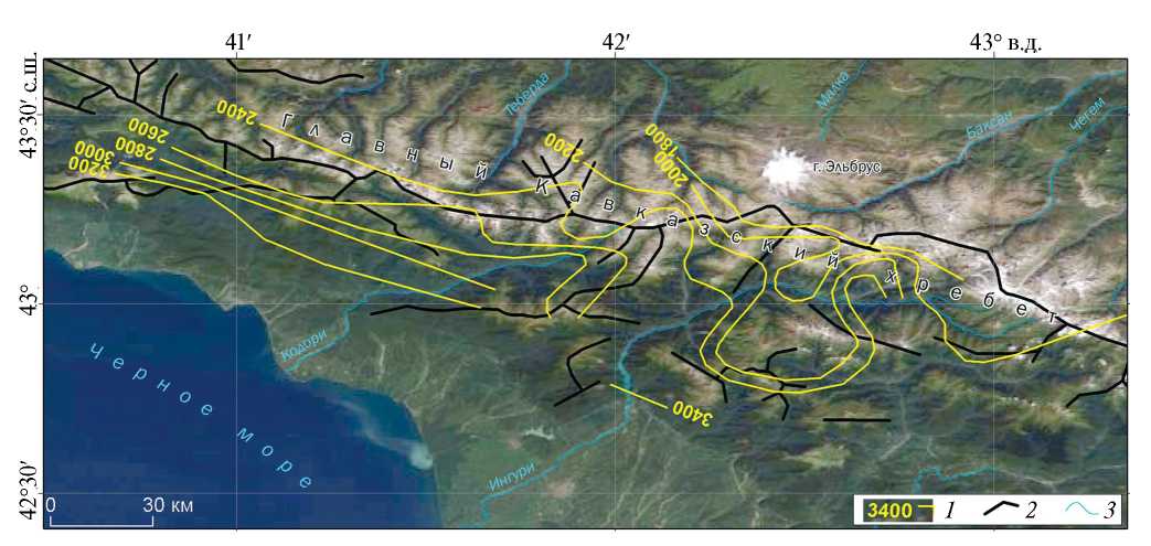 Рис. 1. Распределение твердых осадков на ледниках южного склона Западного и Центрального Кавказа в 1970-е годы по данным (Тареева, 1981). Визуализация на космическом снимке MODIS/TERRA (29.07.2018): 1 – изолинии осадков (мм); 2 – линии основных хребтов; 3 – реки