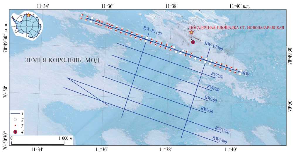 Fig. 1. Location map of the study in the Novo Runway area: 1 – GPR routes; 2 – GNSS survey points 2023/24; 3 – runway marking flags used to calculate ice sheet deformation over a 2-year period; 4 – automatic weather stations Milos 520