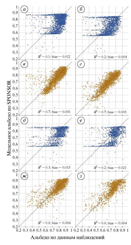Fig. 2. Scatterplots for comparing observational data with model calculations of snow cover albedo using the old scheme (а, б, д, е) and the new scheme (в, г, ж, з). Figures а, в – for the Weissfluhjoch test site, б, г – for the Senator Beck test site, д, ж – for the Swamp Angel test site, е, з – for the Col de Porte test site. Each diagram shows the values of the coefficient of determination R2 and bias