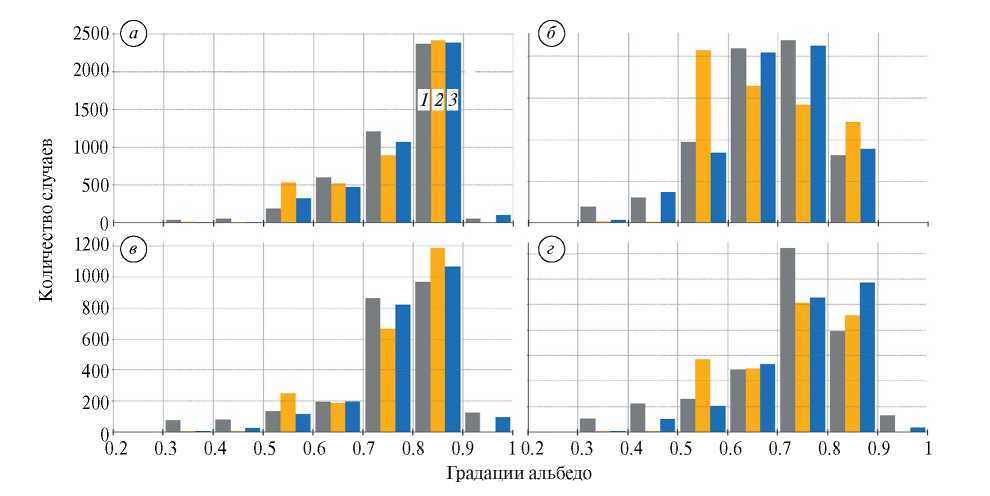 Рис. 3. Частотное распределение случаев попадания значений расчётного и наблюдаемого альбедо в различные градации (ось абсцисс разбита на градации) для полигона Weissfluhjoch (а), для полигона Col de Porte (б), для полигона Senator Beck (в) и для полигона Swamp Angel (г). 1 – столбики для данных наблюдений, 2 – столбики для модельных расчётов SPONSOR по старой схеме, 3 – столбики для модельных расчётов SPONSOR по новой схеме