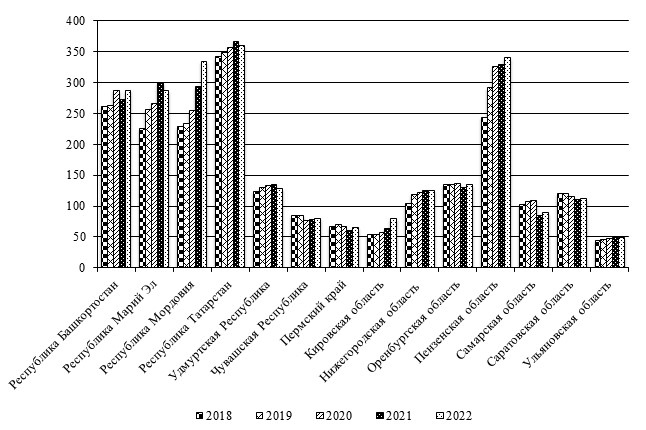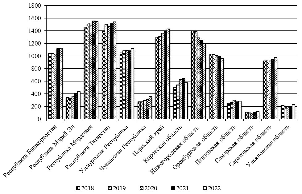 Figure 2. Dynamics of milk production in farms of all categories by regions of the Volga Federal District for 2018 — 2022, thousand tons