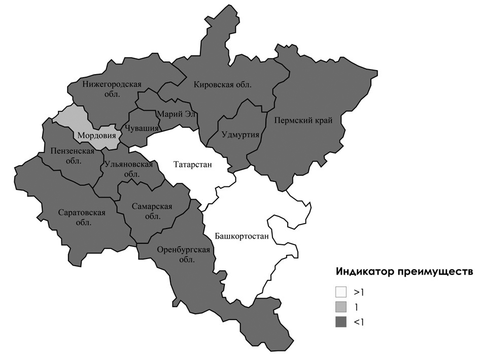 Индикаторы преимуществ позволяют сравнивать значения частных показателей, например, объемы производства мяса, молока и яиц в каждом регионе Приволжского федерального округа со средними значениями по всему округу. Благодаря этому можно более точно оценить, насколько каждый регион соответствует общему уровню развития животноводческой отрасли в округе. В зависимости от значения индикаторов преимуществ регионы можно разделить на три основные группы: