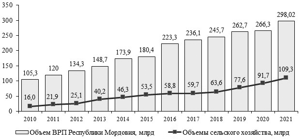 Для проведения анализа обоснуем объем ВРП РМ в разрезе показателя «Сельское хозяйство» и его изменение за 2010 — 2022 гг. За тот период темпы роста ВРП и вклада в него сельского хозяйства имели положительное значение, при этом самый крупный прирост в размере +14,1 % зафиксирован в 2019 г. Данный результат позволил Республике Мордовия войти в топ 5 регионов с самым быстрым ростом экономики. В 2021 г. объем ВРП составил 298,02 млрд руб. Это его максимальное значение за исследуемый период, прирост — +3,1 %. Такой результативности удалось добиться за счет модернизации производств, повышения производительности труда и применения инновационных технологий. В разрезе структуры ВВП сельское хозяйство составляет 16,6 %1.