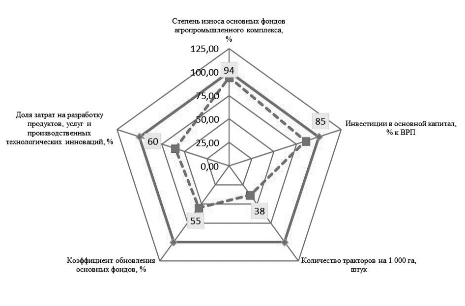 - индикаторы «Доля затрат на разработку новых продуктов, услуг и производственных технологических инновации» и «Коэффициент обновления основных фондов» находятся в зоне «критического» риска и составляют соответственно 60 и 55 %. Данное положение свидетельствует о том, что реальной угрозой инвестиционной сферы агропромышленного комплекса РМ можно считать низкий уровень инновационных разработок для АПК, которые могли бы стать основным драйвером роста и обновления производственных фондов;