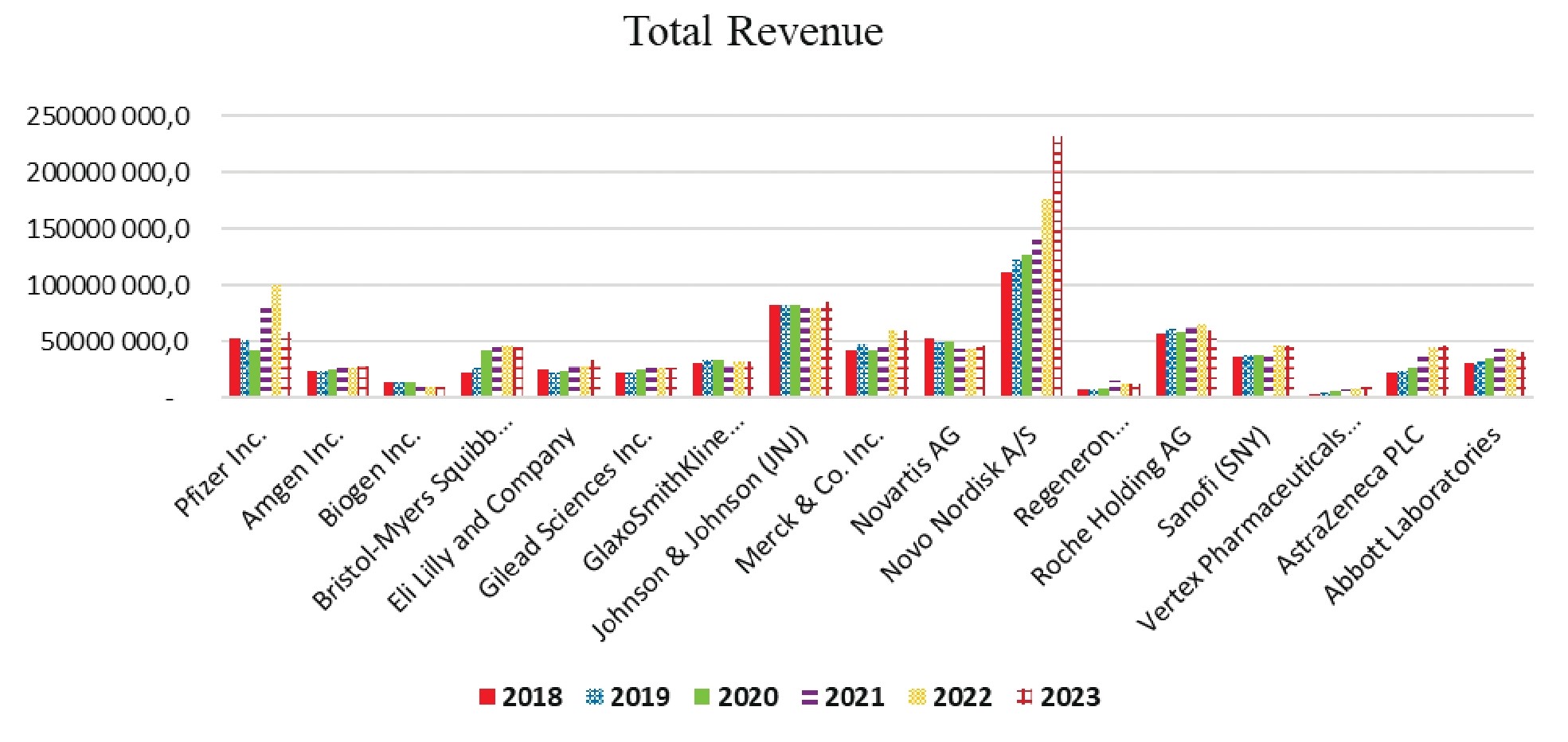Стоит отметить, что с 2019 года в связи с началом пандемии некоторые компании, такие как Pfizer, AstraZeneca, Johnson & Johnson увеличили продажи благодаря выпуску вакцины от COVID-19. За последние шесть лет большая часть компаний демонстрирует устойчивый ежегодный рост общей выручки. Так как выбранные международные корпорации являются лидерами рынка и имеют цифровую стратегию развития с учетом и опорой на концепцию Pharma 4.0, то можно сделать вывод, что рост выручки может быть связан со снижением издержек благодаря внедрению цифровых технологий, в том числе цифровых двойников в производственные циклы (см. рисунок 4).