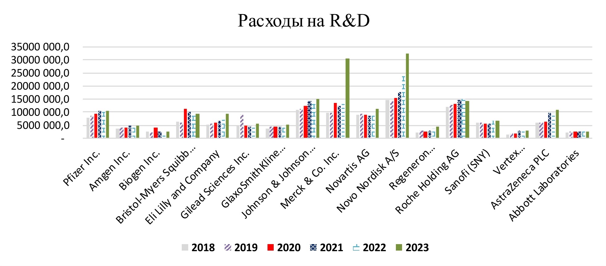Рисунок 5. Динамика расходов биотехнологических компаний на R&D, 2018–2023 гг., тыс долларов США