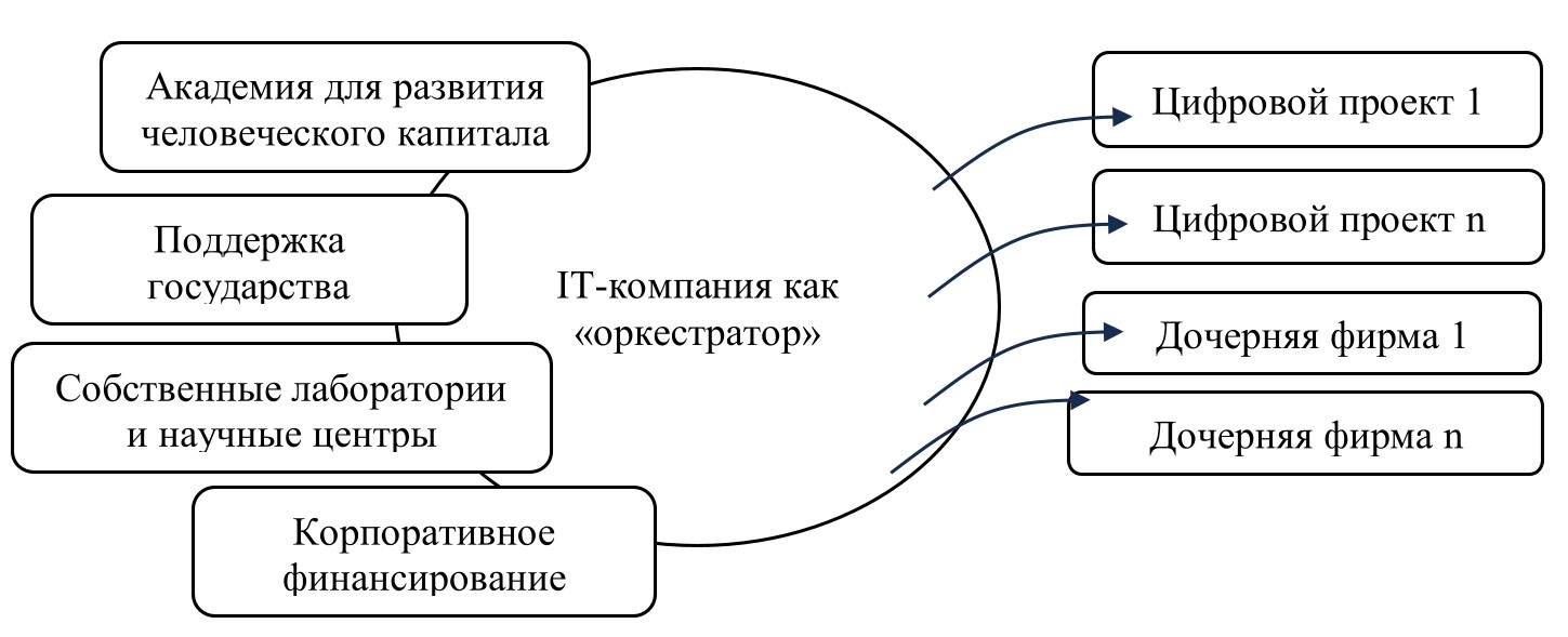 В ранних исследованиях экосистем компания-якорь выделяется в качестве субъекта, наряду с другими – посредниками, университетами, венчурными капиталистами. В свою очередь в современных научных работах оркестратором экосистемы могут быть «гиганты цифровой экономики» (Microsoft, Google, Cisco или Walmart). В таких системах «оркестратор» задействован в процессах организации, создании технической инфраструктуры, условий для роста бизнеса и прибыльности. В. В. Попов [6] выделяет типы экосистем в зависимости от роли оркестраторов – одно-, двух- и мультиоркестрацию. Модель экосистемы включает сети корпораций-лидеров с малым, средним бизнесом, который развивается вокруг технологической базы, системных интеграторов, поставщиков решений, операторов, клиентов и т. п. [16].
