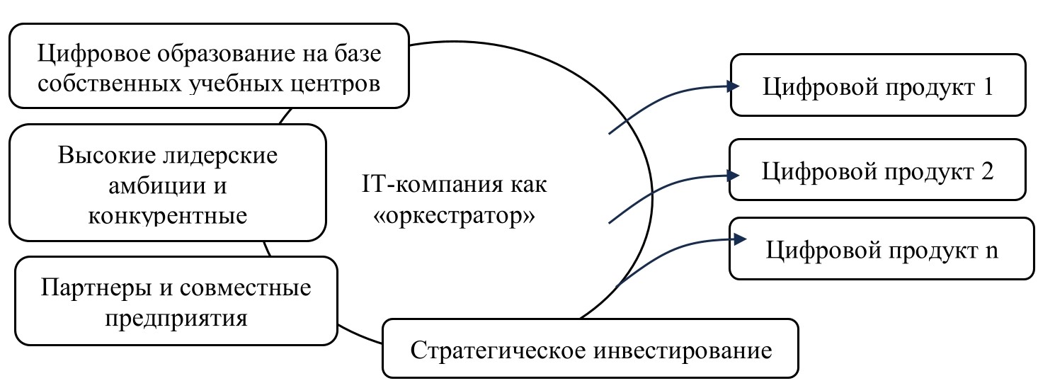 Базируясь на стратегиях оркестраторов экосистем, Г. В. Бутковская, Е. В. Сумарокова [3] выделили три ключевых архетипа. Первый связан с партнерством в экосистеме, когда у оркестратора имеется продуктовая линейка в традиционных отраслях. Стратегия заключается в переходе на широкий перечень услуг и платформенный способ продаж при достижении желаемого масштаба. Второй архетип основан на стратегии расширения сети путем включения компаний сектора ИКТ с широкой клиентской базой для предоставления платежных и логистических услуг. Второй архетип отличается стратегией диверсификации, стремлением к росту и долгосрочной устойчивости. Третий архетип основан на комплексной стратегии и развитии экосистем за пределами своей клиентской базы, применении инновационной стратегии и создания цепочек добавленной стоимости.