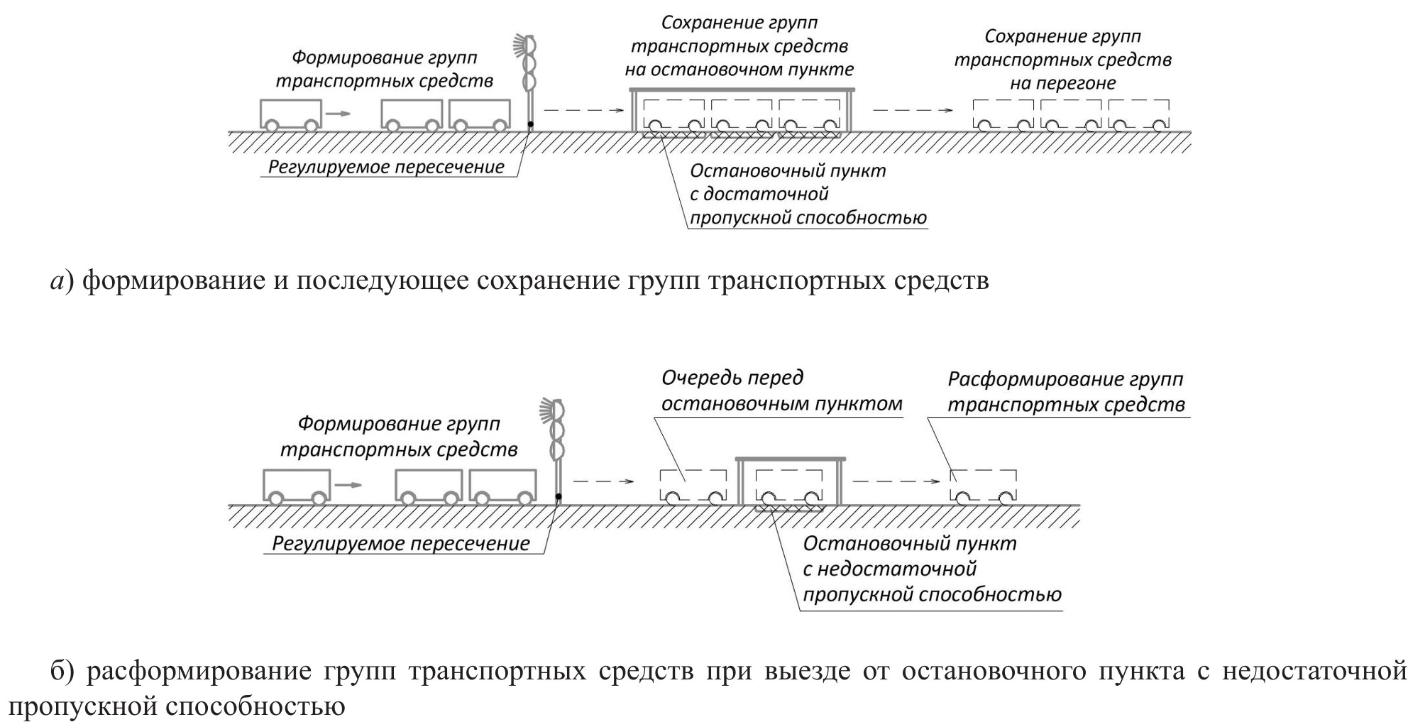 Группа формируется в период задержки, когда первое транспортное средство группы останавливается на запрещающий сигнал светофора, а транспортные средства, следующие за ним, выстраиваются друг за другом. Дальнейшая целостность группы обеспечивается, если пропускная способность очередного и последующих остановочных пунктов превышает частоту поступления транспортных средств. Заданная пропускная способность остановочных пунктов обеспечивается за счёт организации на них необходимого количества посадочных площадок в количестве не менее численности транспортных средств в сформированных группах (рисунок 1а).
