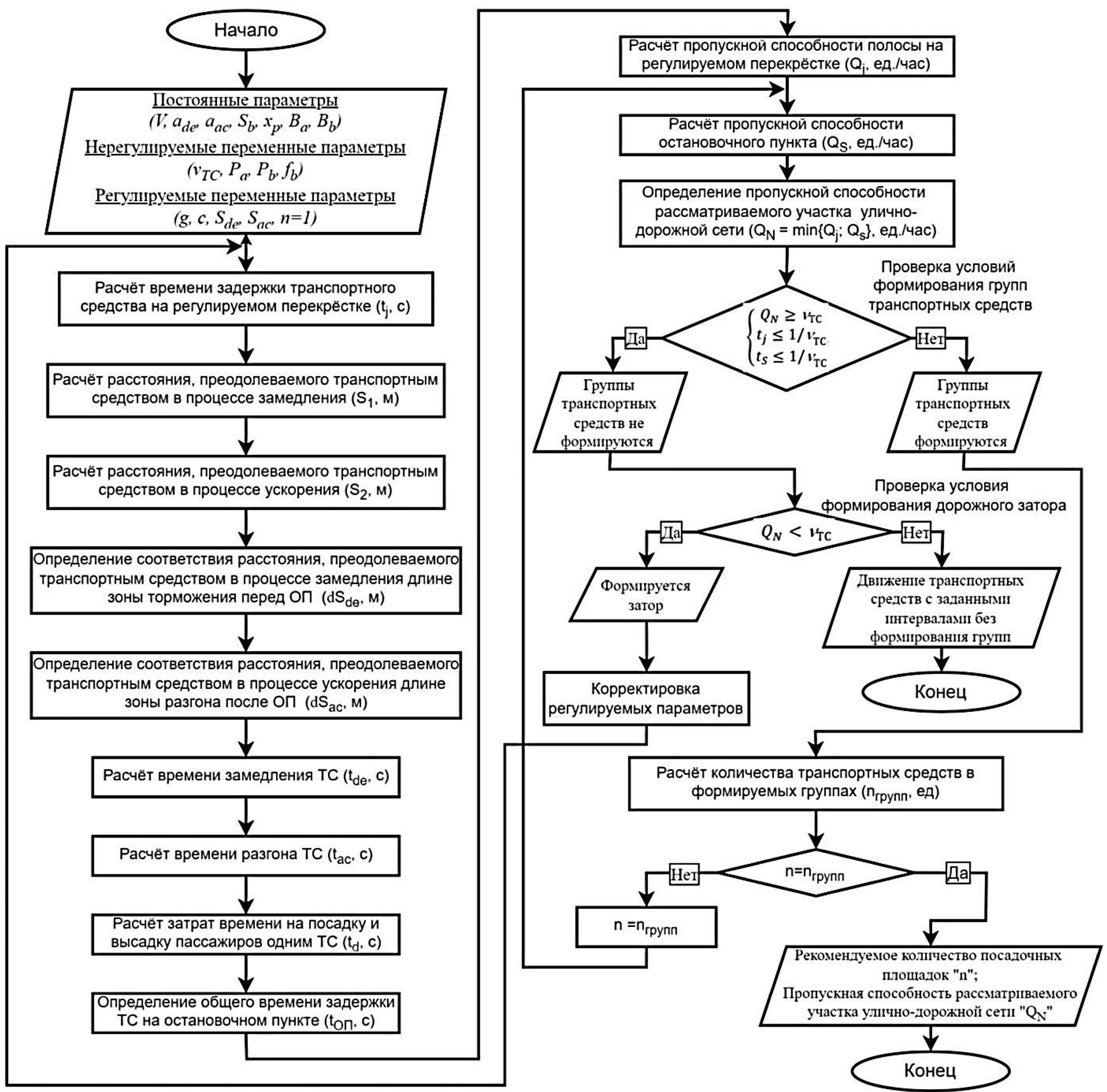 Рисунок 2. Схема алгоритма моделирования пропускной способности участка улично-дорожной сети