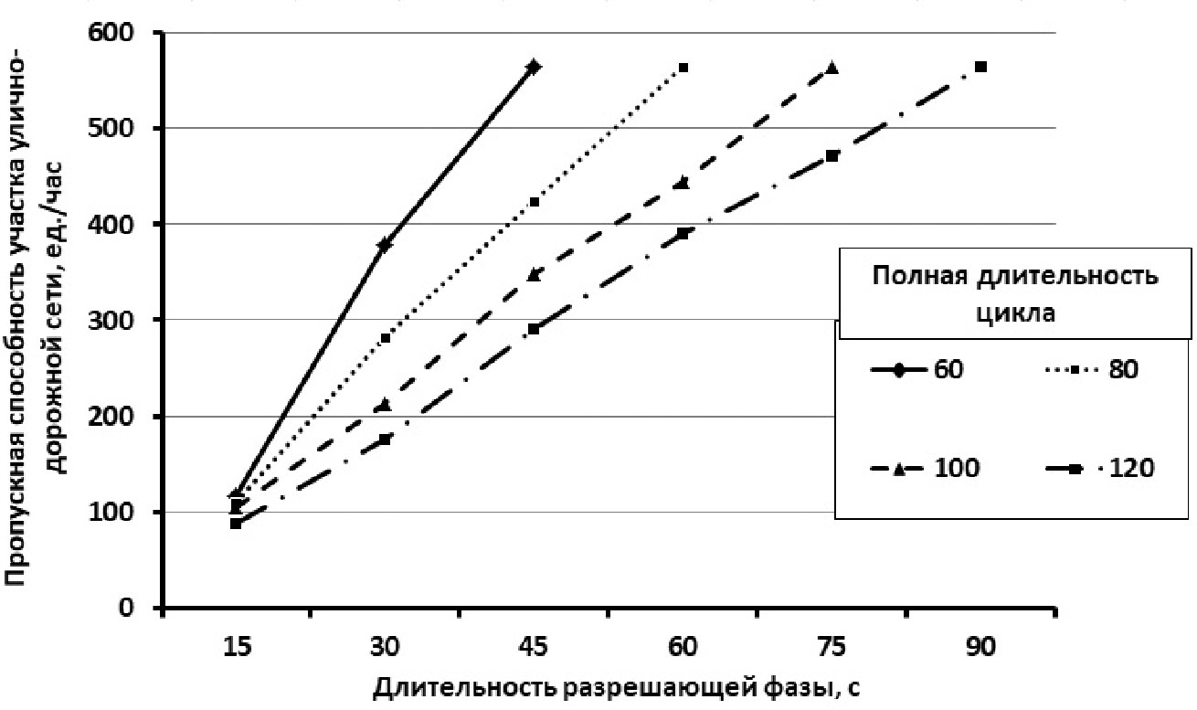 Рисунок 5. Зависимости пропускной способности элементов улично-дорожной сети от параметров дорожной инфраструктуры