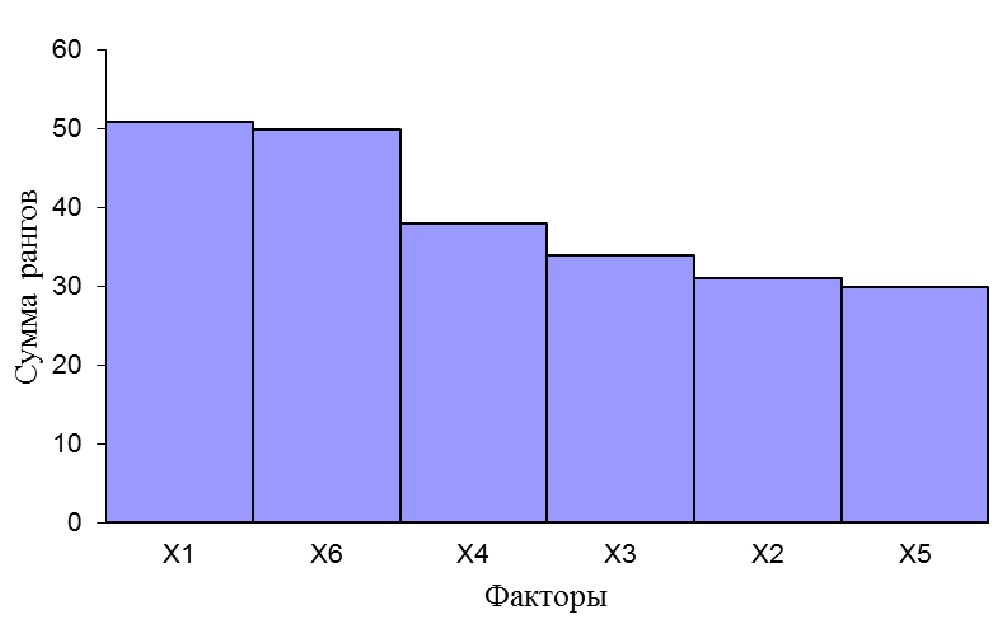 Рисунок 1. Диаграмма рангов, отражающая степень влияния разных факторов, характеризующих систему МТО и влияющих на простои автомобилей, по мнению экспертов