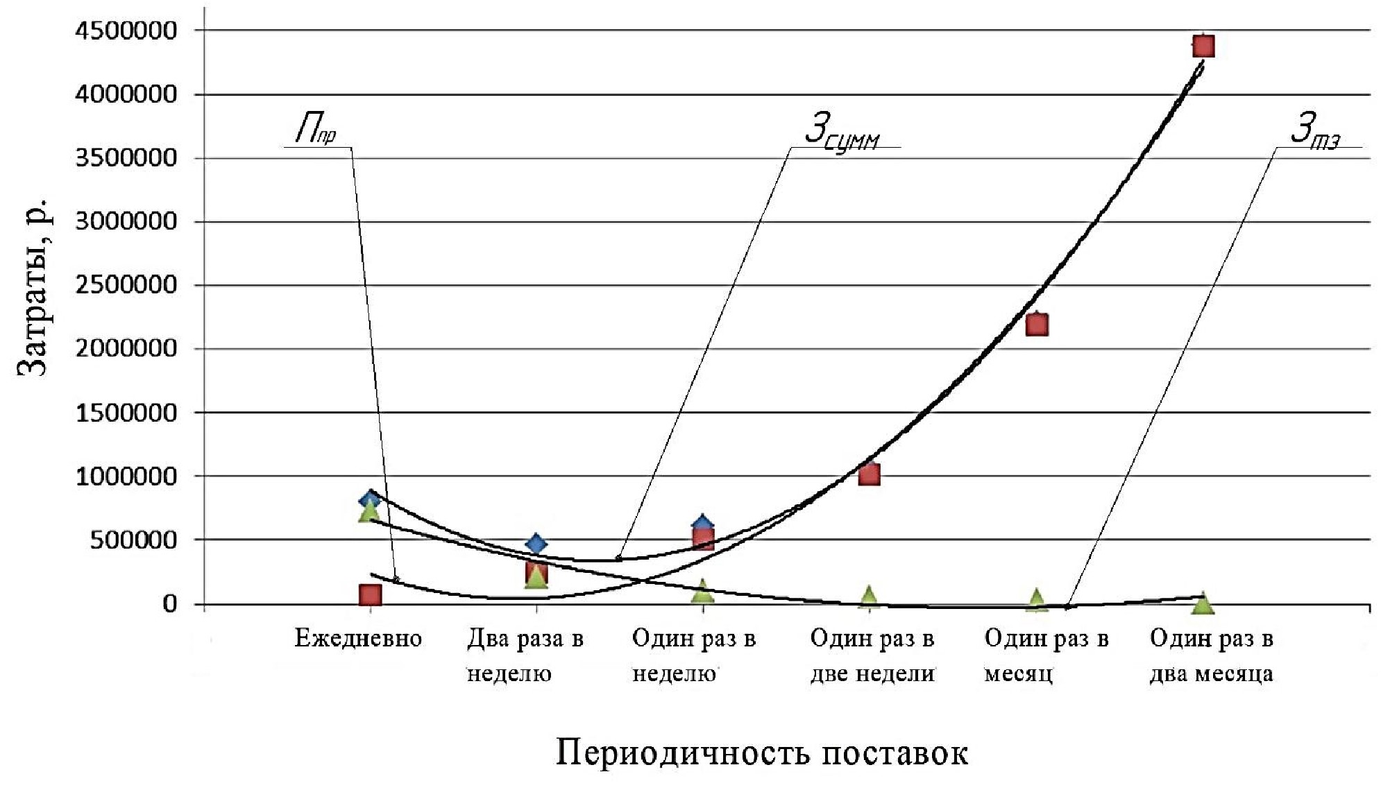 Рисунок 2. Результаты установления оптимальной периодичности поставок материально-технических ресурсов