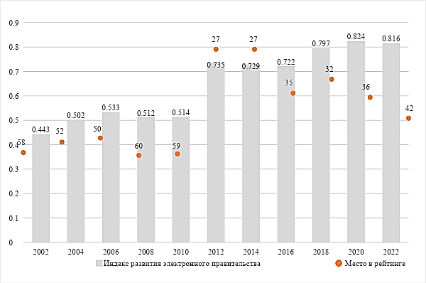 Рисунок 1. Динамика Индекса развития электронного правительства и позиция Российской Федерации в мировом рейтинге, 2002-2022 гг.4