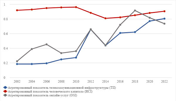 Год | Агрегированный показатель телекоммуникационной инфраструктуры (TII) | Агрегированный показатель человеческого капитала (HCI) | Агрегированный показатель онлайн-услуг (OSI) |