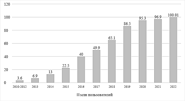 Рисунок 4. Динамика численности пользователей Единого портала государственных услуг в РФ, 2010-2022 гг.[10]