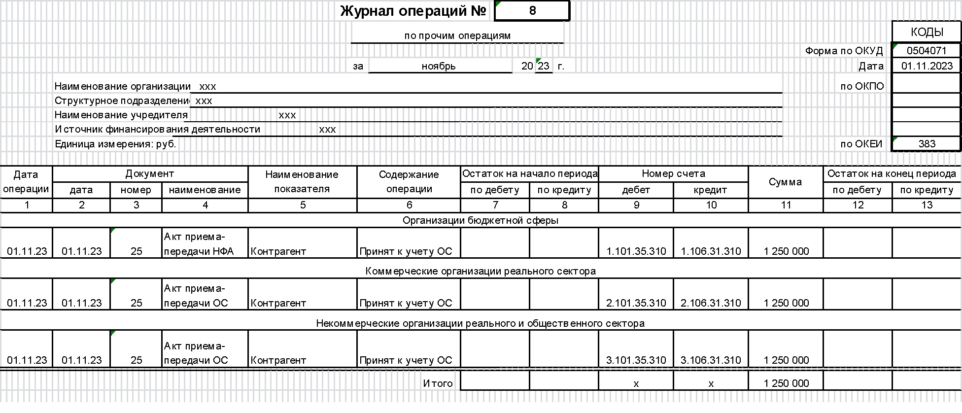Журнал операций имеет единую структуру, отличается номером и названием, применяется для формирования главной книги государственного учреждения и составления бюджетной (бухгалтерской) отчетности. Основное его назначение обобщить данные для синтетического учета и подтвердить санкционирование совершенных фактов хозяйственной жизни для целей контроля за рациональным и экономным расходованием государственных финансов. Для целей контроля такой регистр необходим и для коммерческих организаций реального сектора и некоммерческих организаций реального и общественного сектора.