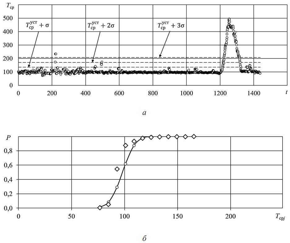 Рисунок 1. Осредненные продолжительности Tсрj (с) движения автомобилей (–о–) и пороговые значения (– – –) их отклонения на σ, 2σ и значений от Tсруст (а); теоретическое (–о–) и эмпирическое (–◊–) распределения P вероятности осредненных продолжительностей Tсрj движения автомобилей между рубежами контроля (б); наблюдение в течение суток 9 мая 2022 года