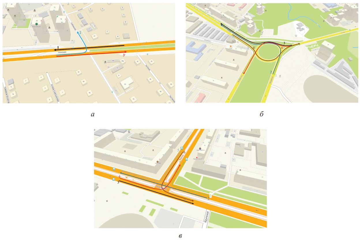 3. Figure 2. Types of main intersections of the street and road network in the city of Perm: X-shaped (a; intersection of "Uinskaya Street - Griboyedov Street"), roundabout (b; intersection of "Uinskaya Street - Turgeneva Street - Makarenko Street") and T-shaped (c; intersection of "Krupskoy Street - Uralskaya Street"); arrows and numbers indicate the direction of possible movement (comments in the text)