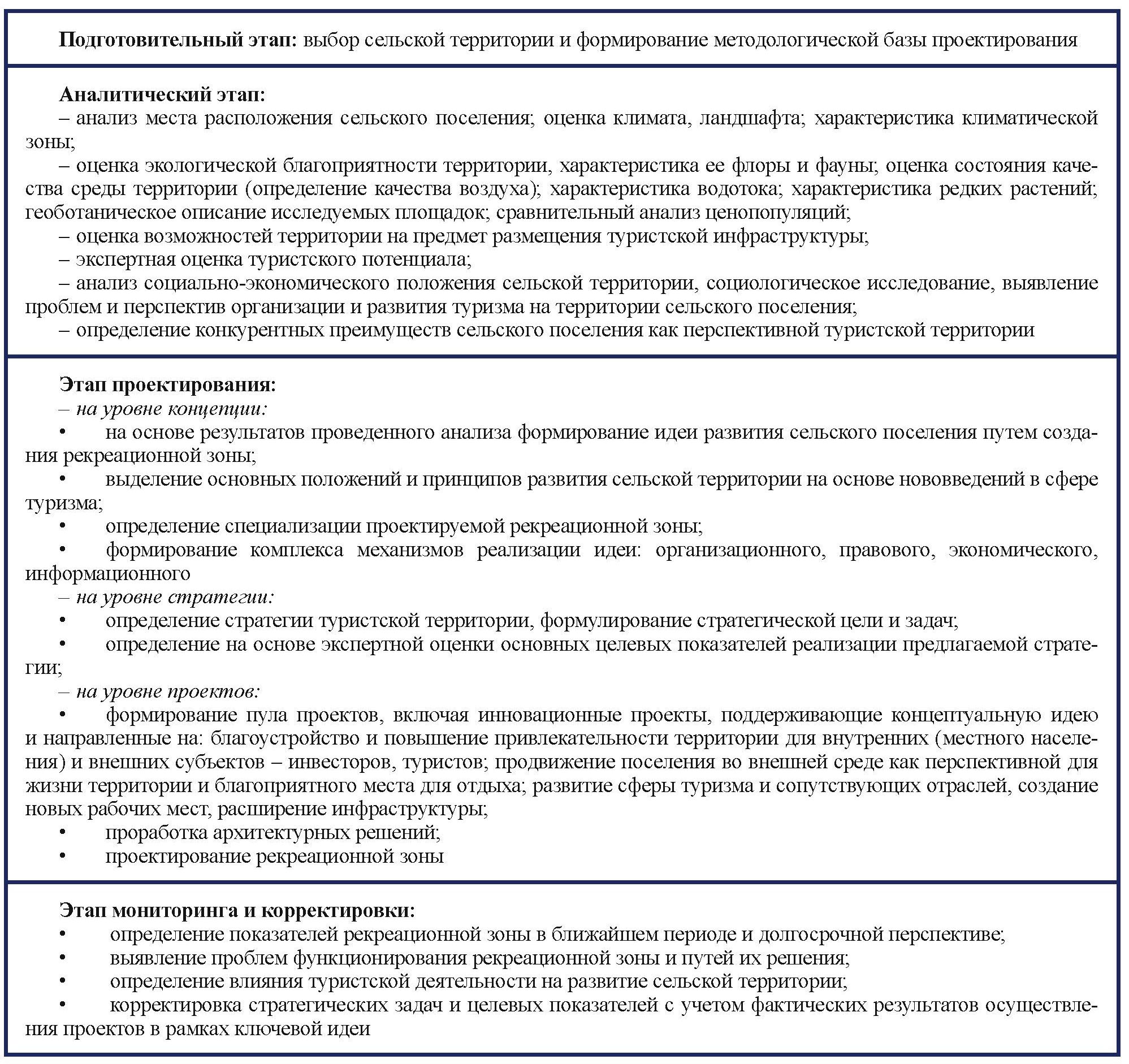 Обобщая вышеизложенное, можно заключить, что разработанный в рамках настоящего исследования проектный подход к развитию сельских территорий на основе нововведений в туризме развивает и продолжает имеющиеся малочисленные теоретические изыскания в этой области. Новизна подхода заключается в том, что он позволяет осуществить инновационное проектирование и комплексное освоение туристской территории при максимальной реализации природного и культурно-исторического потенциала сельского поселения путем создания специализированной рекреационной зоны.