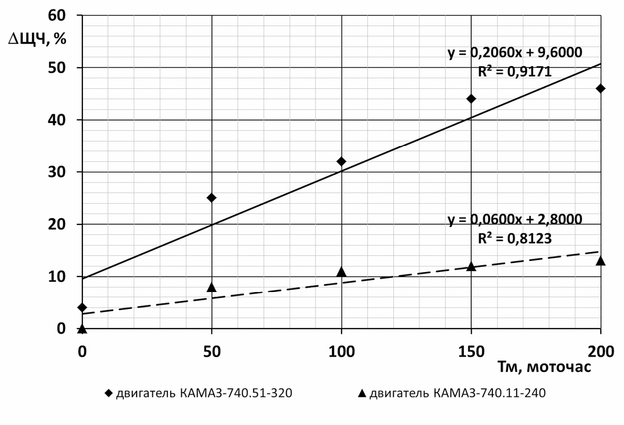 На рисунке 2 показано сравнение изменения ∆ЩЧ моторного масла Лукойл Супер SAE 15W-40 API CF-4/SG от наработки в двигателях КАМАЗ-740.11-240 240 (Е = 16,5; Nе = 176,5 кВт; Gм = 25,5 кг; А = 505) и КАМАЗ-740.51-320 (Е = 16,5; Nе = 235,3 кВт; Gм = 25,5 кг; А = 770).
