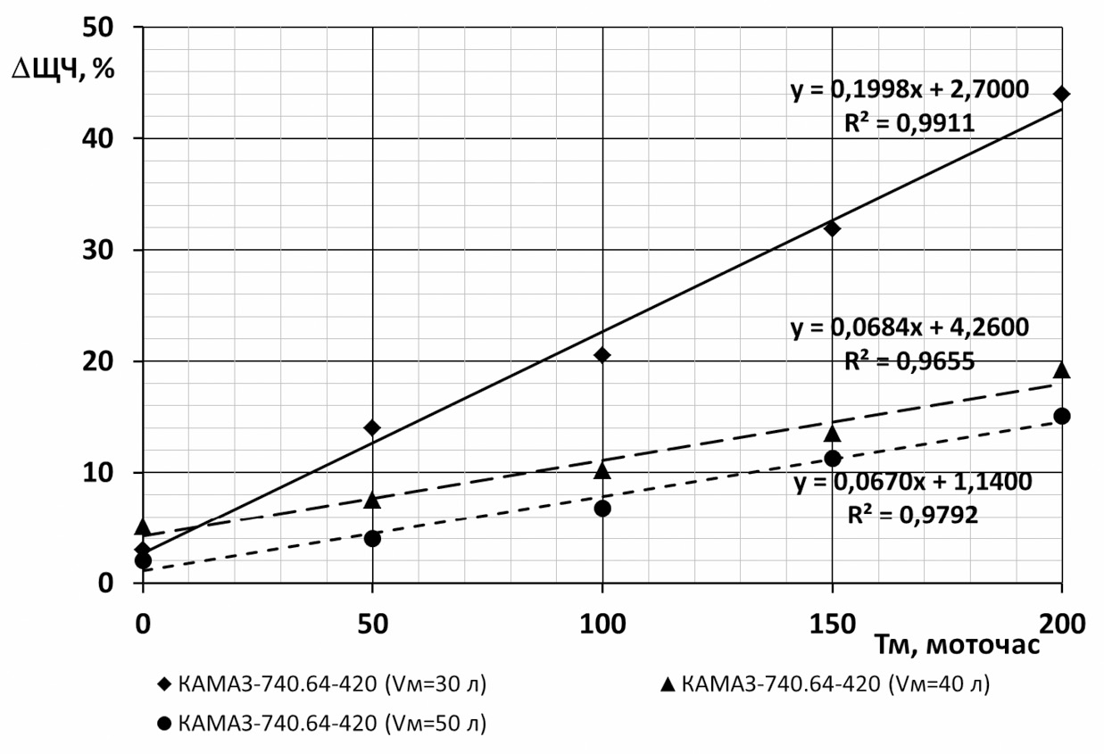 Динамика «старения» масла оценивалась по зависимостям относительной величины снижения ∆ЩЧ (в процентах) от наработки t (в моточасах). Опытные значения ∆ЩЧ (y) от наработки (x) аппроксимировались линейной моделью вида у = ах + b. Критерием оценки служили скорость изменения ∆ЩЧ от t, т. е. значения коэффициента a, а также потенциальный срок замены, как наработка при достижении предельного значения ∆ЩЧ = 50% (y = 50), т. е. Тм = (50-b)/а.