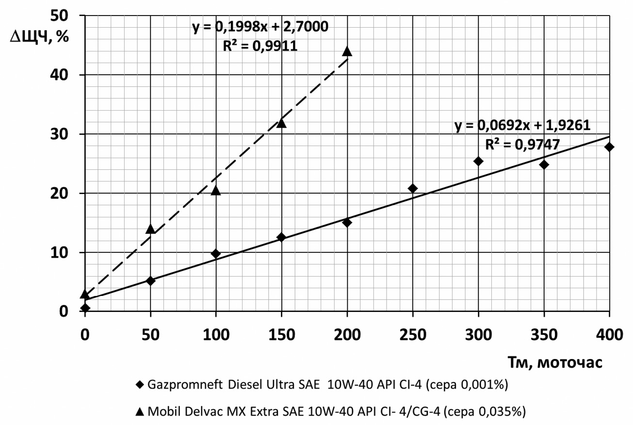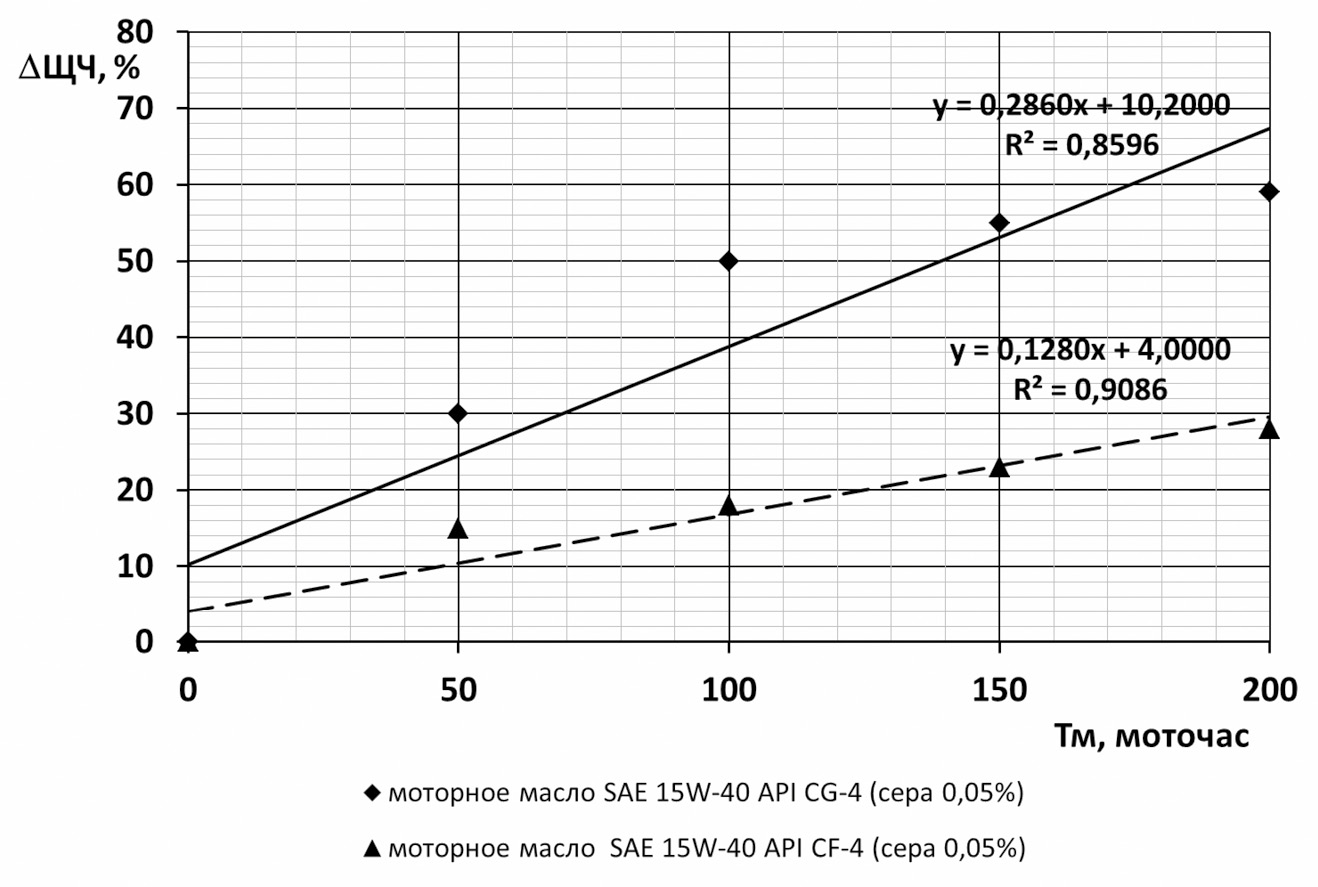 На рисунке 4 показана зависимость ∆ЩЧ разных моторных масел одного класса вязкости SAE 15W-40, но разных классов по API (CF-4, CG-4) в ходе стендовых испытаний на двигателе КАМАЗ-740.50-360 (Е = 16,5; Nе = 264,7 кВт; Gм = 25,5 кг; А = 916) с применением топлива с содержанием серы до 0,05%.