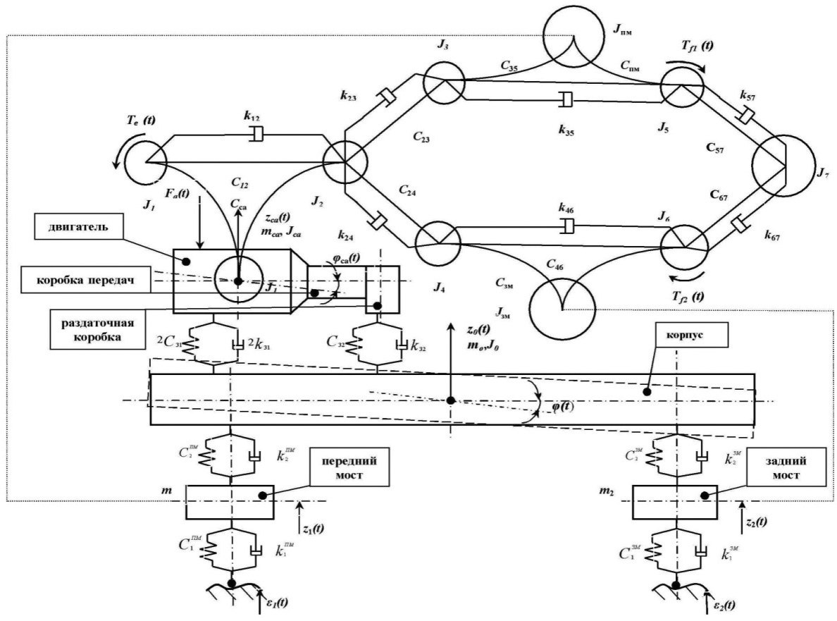 Рисунок 1. Эквивалентная комплексная динамическая модель транспортно-технологического средства с колёсной формулой 4×4 для расчёта вертикальных, продольно – угловых, крутильных колебаний трансмиссии, а также пространственных колебаний силового агрегата при движении по различному опорному основанию