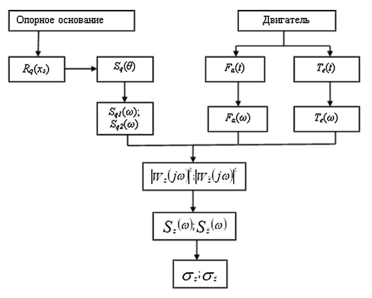 Рисунок 2. Блок-схема вычисления средних квадратических значений виброускорения при случайном возмущающем воздействии со стороны дороги и двигателя