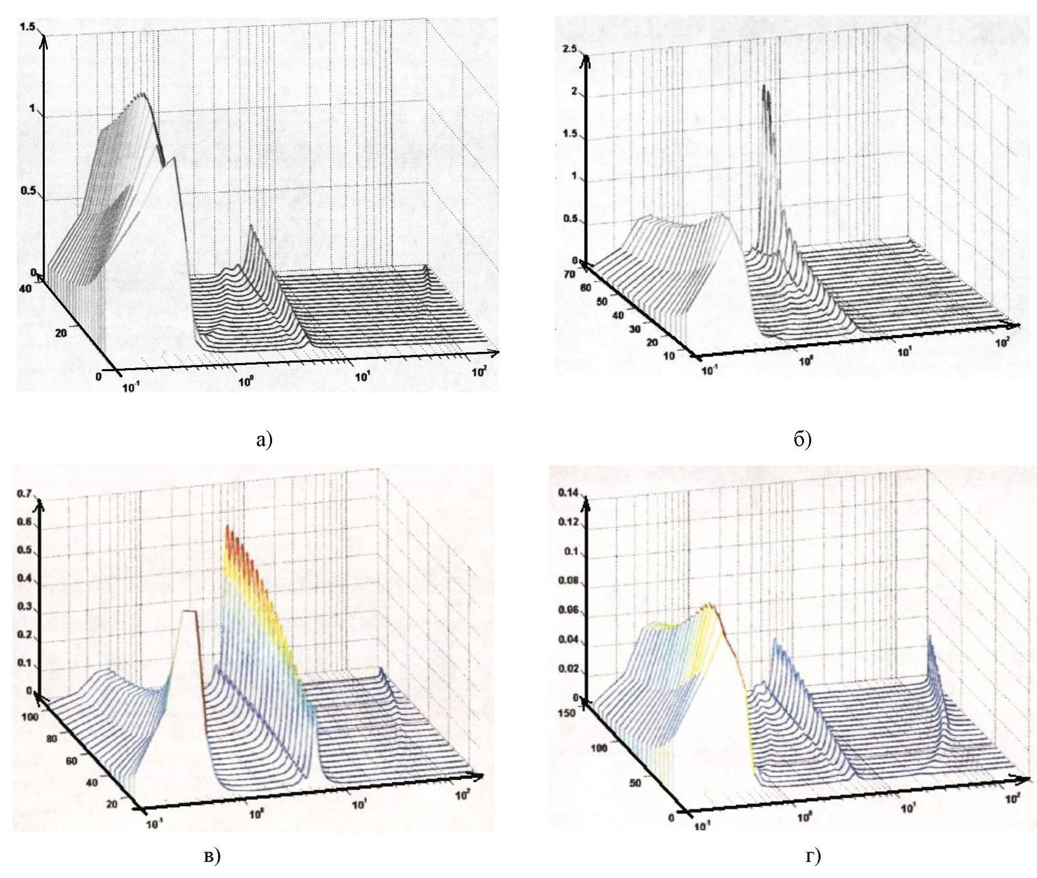 Анализ графиков, приведенных на рисунке 3, даёт возможность разделить частотную область данных спектральных характеристик на пять диапазонов. В каждом из них наблюдаются всплески спектральных плотностей виброускорений, обусловленные влиянием динамики элементов конструкции объектов исследования при их движении по различному опорному основанию с различными скоростями: