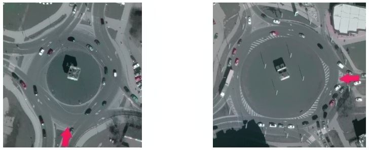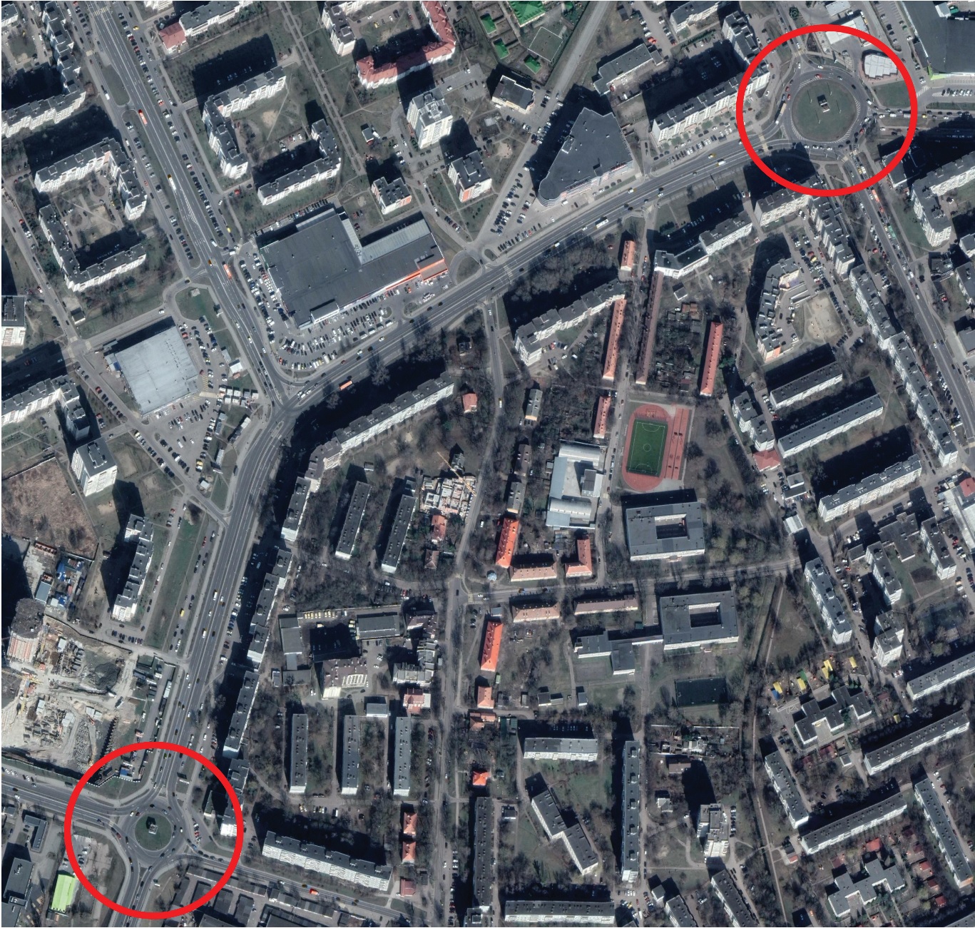 Анализ был сосредоточен на двух кольцевых пересечениях, на которых в период с конца 2019 года по настоящее время используется спиралевидная разметка (рисунок 1). Данные пересечения не являются местами концентрации ДТП, однако в результате предыдущих исследований [2, 4] было выявлено, что на кольцевых пересечениях Калининградской области более 80% ДТП не приводят к травмам, что фактически исключает их из официальной статистики.