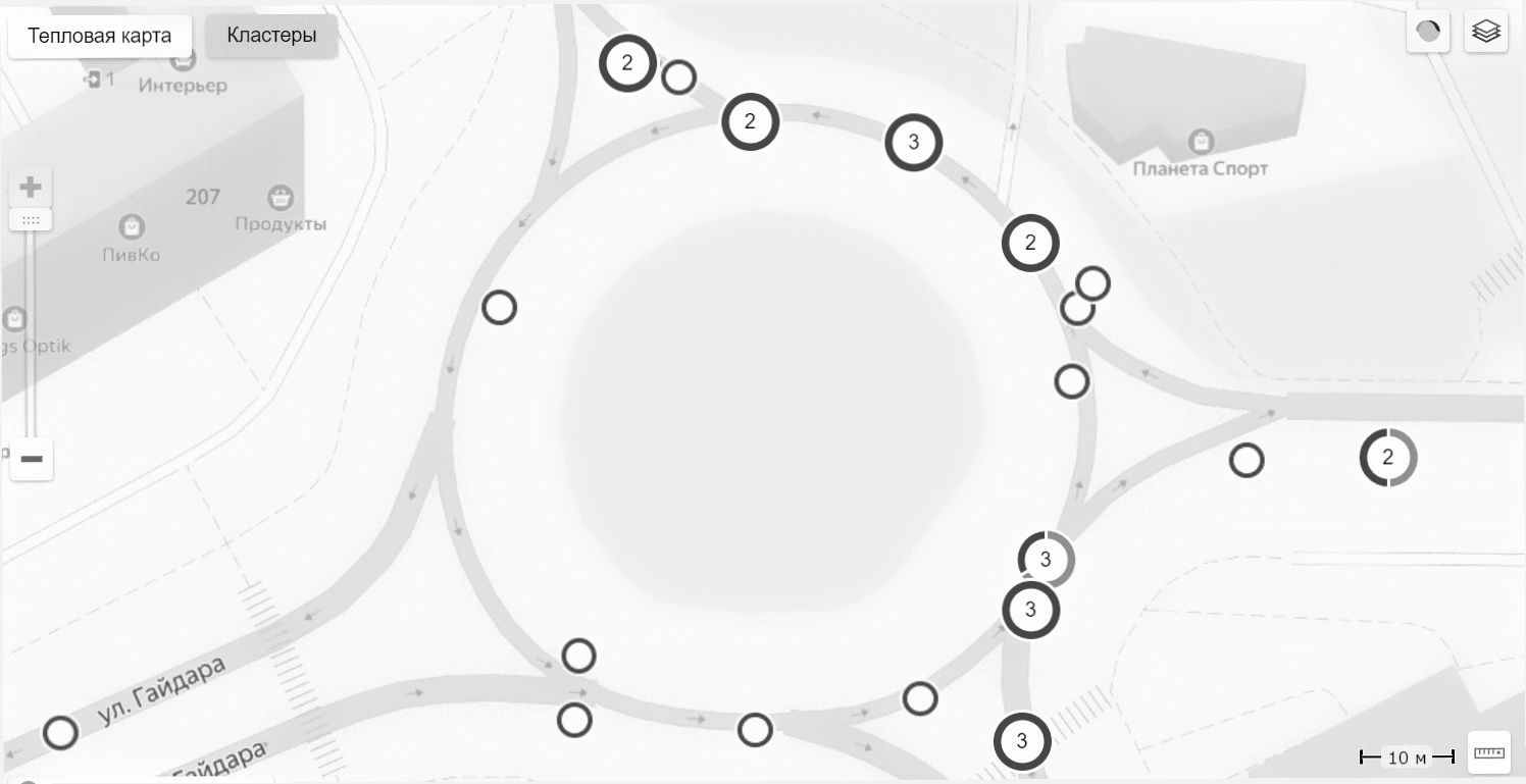 Рисунок 7. Местоположение происшествий с пострадавшими (светло-серые) и без пострадавших (чёрные) на пересечении Гайдара-Челнокова за период с 2020 по 2022 гг.
